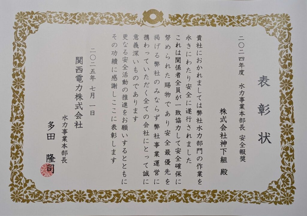 2025年度 関西電力株式会社 安全健康大会水力部会において、水力事業本部長表彰をいただきました。
