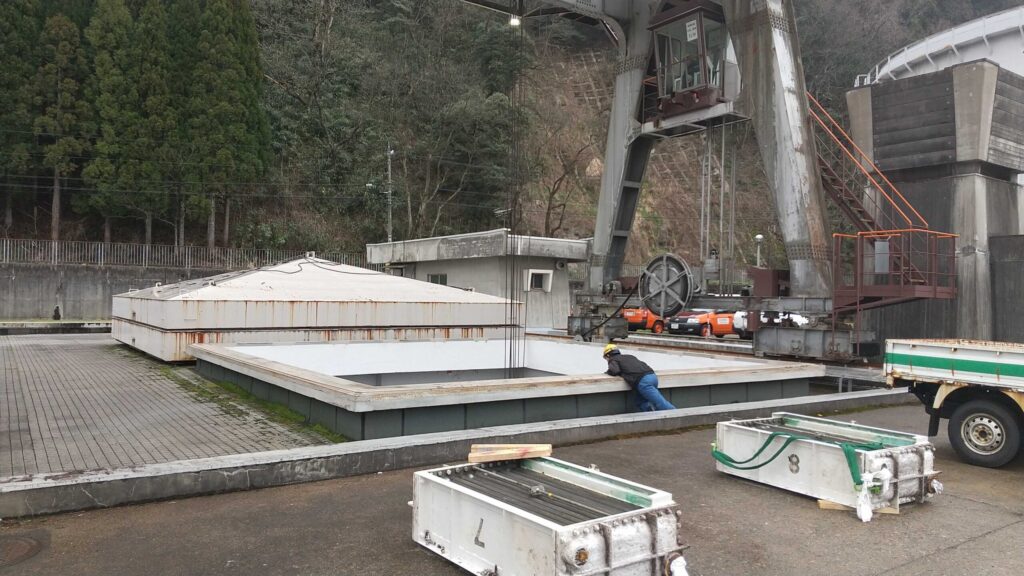 水力発電所内の地下への設置工事では、天蓋を開けての作業ですので、上下作業に注意が必要な状況でした。